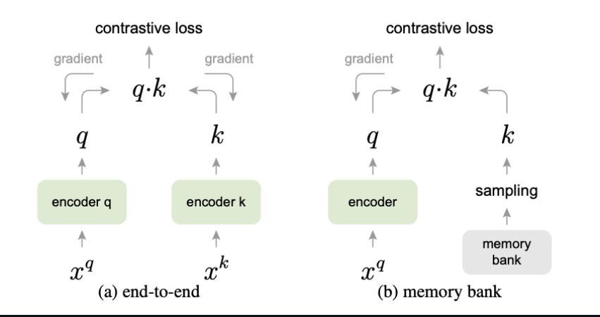 在MoCo前有两种经典的对比学习模型:SimCLR, Memory Bank