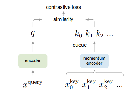 • 引入动量机制,query encoder可以通过反向传播更新参数,而key encoder即momentum encoder需要通过动量机制更新参数,使得key encoder的参数只随query encoder缓慢更新,保证负样本的一致性